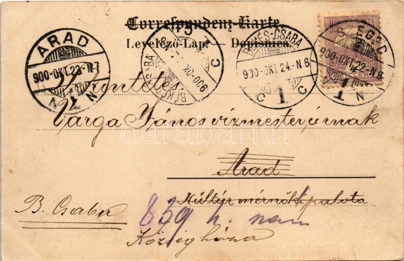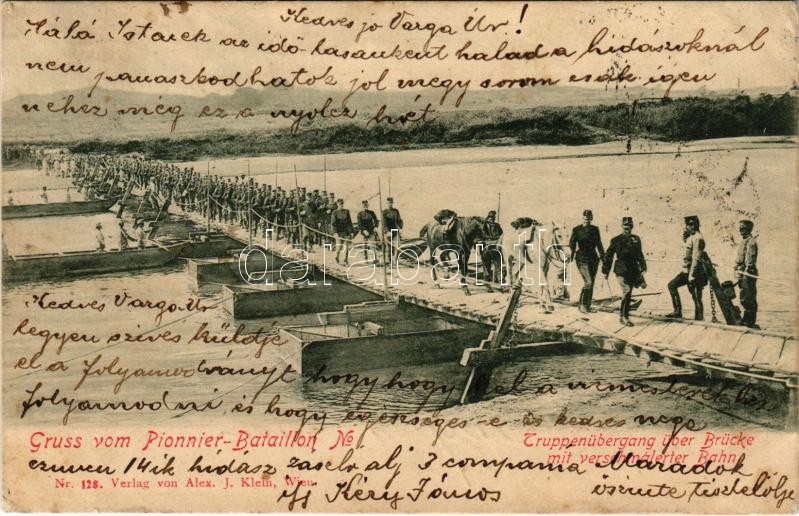 Description: 1900 Gruss vom Pionnier-Bataillon. Truppenübergang über Brücke mit verschmalerter Bahn. Verlag v. Alex. J. Klein / Austro-Hungarian K.u.K. military, troops crossing a pontoon bridge (kis szakadás / small tear)