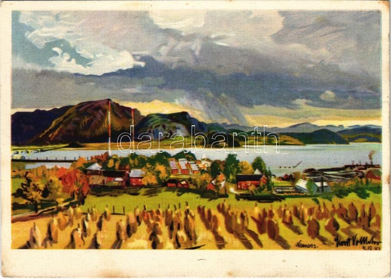 Description: Die verbrannte Fjordstadt "Namsos", berühmt durch den englischen "siegreichen" Rückzug. Kriegsbild-Dokumente von Ernst Vollbehr. Nordfront Bild 46. / WWII German military art postcard. Kunstverlag E. A. Schwerdtefeger & Co. s: Ernst Vollbehr (fl)