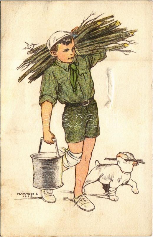 Description: A cserkész híven teljesíti kötelességeit... Kiadja a Magyar Cserkészszövetség Nagytábortanácsa 1926. / Hungarian boy scout art postcard s: Márton L. + So. Spl. (Rb)