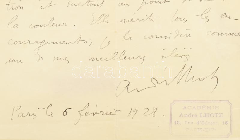 Description: André Lhote (1885-1962) francia kubista festőművész autográf igazolása Bruckner Valéria (1900-1992) magyar festőművész részére / autograph certificate of the French Cubist painter for the Hungarian painter Valéria Bruckner (1900-1992)