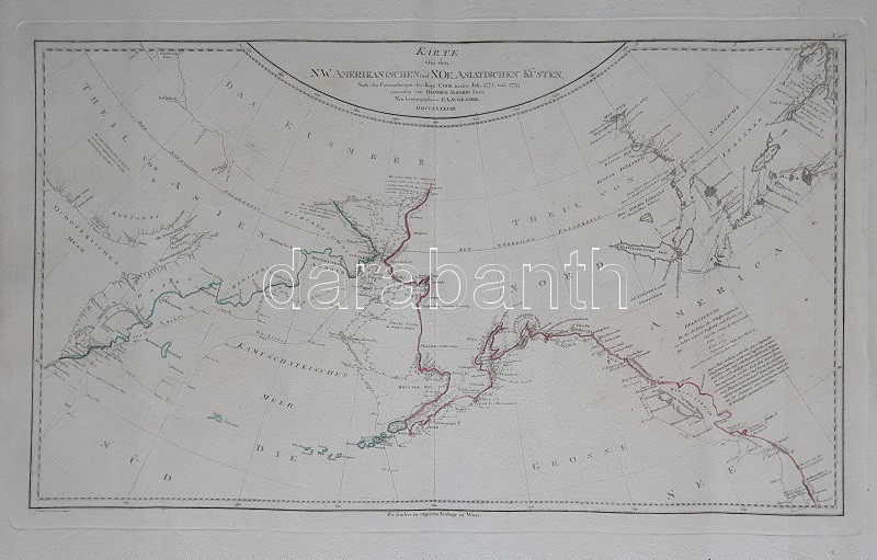 Alaszka és Szibéria partvidéke a Bering-szorostól északra és délre. Széles margójú térkép James Cook 1778-1779. évi harmadik expedíciójának felfedezései nyomán. Német nyelvű, kézzel határszínezett térkép. Henry Roberts adatai alapján szerkesztette Franz Anton Schrämbl bécsi térképész (1788). Karte N. W. Amerikanischen und N. OE. Asiatischer Küsten. Nach den Untersuchungen das Kapit: Cook in den Jah: 1778. und 1779. entworfen von Heinrich Roberts Lieut: Neu herausgegeben von F. A. Schraembl. No. 107. (1788) [Bécs] Wien, [1800]. Franz Anton Schrämbl. Kézzel határszínezett rézmetszet, mérete: 390x680 mm, lemezméret: 430x715 mm, lapméret: 660x865 mm. Kézzel határszínezett, míves kivitelű térképünk Franz Anton Schrämbl bécsi térképész monumentális atlaszában, főművében, az ,, Allgemeiner Grosser Atlas" című kötetben jelent meg, annak 107. számú térképmetszeteként. A mintegy másfél évtizedig készülő album végül 1800-ban látott napvilágot. A térképek szerkesztője, Franz Anton Schrämbl (1751-1803) maga alapította térképészeti kiadóját, és lehetőség szerint a legfrissebb térképészeti felmérések alapján dolgozott. Térképünk központi része James Cook (1728-1779) harmadik felfedezőútjának nyomvonalát rögzíti: az Alaszka és Szibéria közötti északnyugati átjáró feltérképezését célzó expedícióra 1778-1779 között került sor. Az expedíció 1778 során Kanada és Alaszka partjait derítette fel, behatolt a Jeges-tenger vidékére, a tél közeledtével pedig visszavonult a Csendes-óceán déli vizeire. A kapitány és expedíciója 1778-1779 fordulóját a Hawaii-szigeteken töltötte, ahol a kapitány egy végzetes félreértés nyomán életét vesztette, ám az expedíció ennek ellenére folytatódott. A felfedezők 1779 tavaszán és nyarán a másik irányból, tehát Szibéria felől közelítették meg a Bering-szorost, és töltöttek néhány hetet a Jeges-tengeren, majd nyár végén ismét távoztak a sarkvidékről. Kézzel határszínezett expedíciós térképünk a felfedezőút térképésze, Henry Roberts hadnagy adatfelvétele alapján készült, térképünk zöld színnel jelöli a szibériai, vörös színnel az alaszkai és kanadai partokat. Térképünk a partmenti telepek feltüntetésén túl a partvidéki domborzat részleteivel is szolgál, ám a kontinensek vízrajzi részleteit illetően - mivel édesvízi felfedezésre nem került sor - nem közöl adatokat. Jóllehet térképünk elsősorban James Cook 1778-1779. évi expedíciójának topográfiai vetülete, ám a térkép Kanada belső területén egy másik, korábbi expedíció feltárásait is bemutatja, nevezetesen Samuel Hearne skót felfedező 1771-1772. évi útját, melynek során a skót felfedező, Hudson-öbölparti bázisáról kiindulva északnyugat felé törve, az összefüggő folyórendszerek és nagyobb tavak érintésével elsőként érte el a Jeges-tengert. Térképünk e része a tengerparti részekhez hasonlóan domborzati részletekben is gazdag, és kivételesen belföldi vízrajzi részleteket is jelöl. Szép állapotú lap, hátoldalán erősítő papírcsíkkal, a lap alján és jobb szélén kisebb, a szedéstükröt a legkevésbé sem érintő, halvány foltossággal.