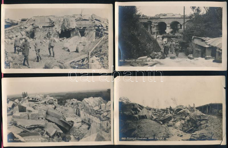 1915 Przemyśl és környéke (Lengyelország), megrongálódott osztrák-magyar védőállások, a károkat szemlélő katonatisztek, hídépítő orosz hadifoglyok, összedőlt vashíd. 12 db eredeti fotó, változó állapotban, 14,5x9 cm körüli méretben. / 1915 Przemyśl and its surroundings (Poland), destroyed Austro-Hungarian defensive positions, officers observing the damages, Russian POWs building a bridge, collapsed iron bridge. 12 original photos, mixed condition, around 14.5x9 cm.