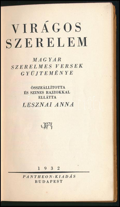 Lesznai Anna: Virágos szerelem. Magyar szerelmes versek gyüjteménye. Összeállította és színes rajzokkal ellátta: - -. Bp., 1932, Pantheon,(Hungária-ny.), 159+1 p. Kiadói félvászon-kötés, Kner Erzsébet-kötés, kopott, foltos borítóval, ajándékozásra vonatkozó bejegyzéssel és hozzá tartozó két beragasztott címkével. Megjelent 1200 példányban.