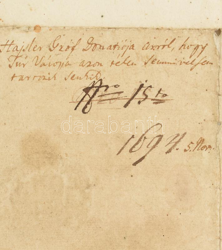 1694 Pest, Donathus Heissler comes ab Heitersheim. (Donat Johann Heißler von Heitersheim (1648-1696) német lovag, dragonyos kapitány, majd német-római császári hadvezér, báró, majd gróf), a török ellenes háborúban Arad és Temesvár felszabadítója, majd Thököly rabja, donatiója hogy Túr (Mezőtúr) városa ezen a télen semmivel sem tartozik senkinek. Papírfelzetes viaszpecséttel