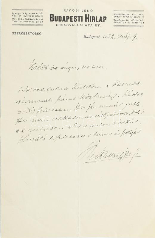 Description: 1922 Rákosi Jenő (1842-1929) író, újságíró, a Budapesti Hírlap (1881-1925) főszerkesztőjének autográf levele ifj. Bókay János (1892-1961) író, műfordító részére, a Budapesti Hírlap fejléces papírján, 1922. máj. 9.