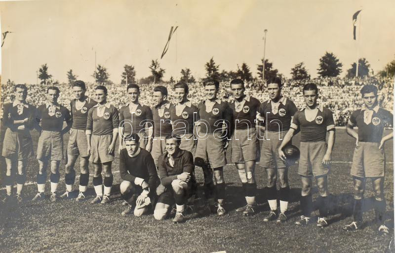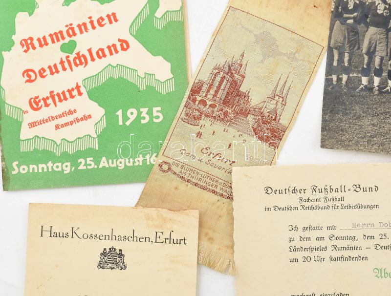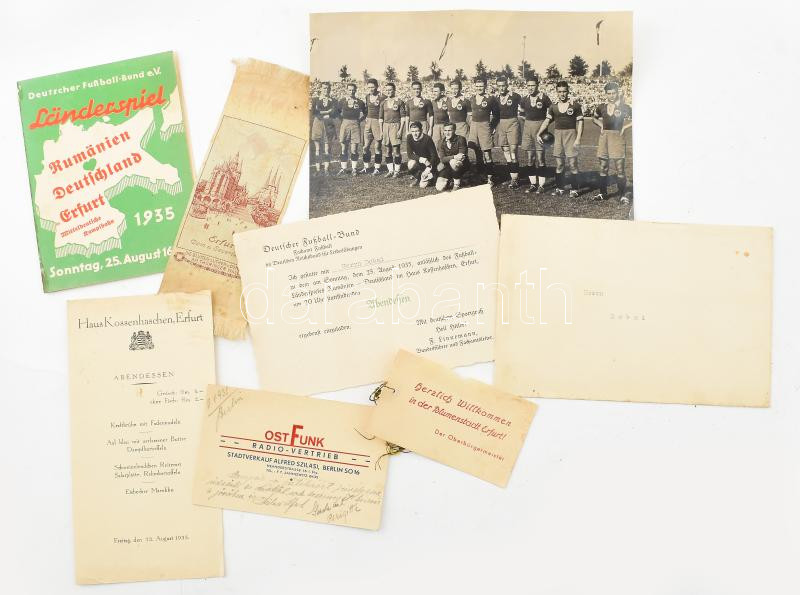 1935 A németországi Erfurtban 1935.VIII.25-én játszott Németország-Románia (4:1) válogatott futballmeccs relikviái, össz. 8 db, közte Dobai (Dobay) István részére szóló meghívó a mérkőzés utáni díszvacsorára, menükártya, a meccsről készült német sajtófotó, könyvjelző, stb. Dobay István (1909-1994) román válogatott labdarúgó, csatár, későbbi edző hagyatékából. (A mérkőzésen a román csapatban pályára lépett). / 1935 Football relics from the Germany-Romania (4:1) match, played in Erfurt, Germany, 25.VIII.1935. 8 pcs in total. From the inheritence of Stefan (István) Dobay Romanian football player (who played on the Romanian team in this match).
