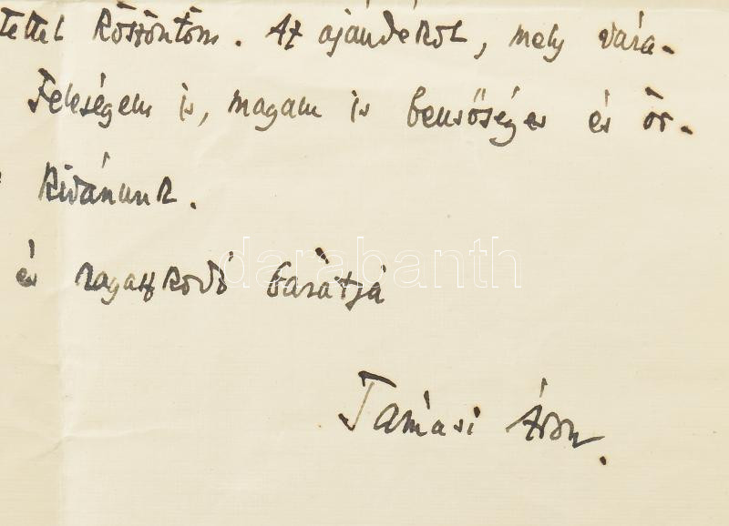 1943 Kolozsvár, Tamási Áron (1897-1966) író autográf levele Bókay Jánosné, ifj. Bókay János (1892-1961) író, műfordító felesége részére, benne meleg hangú üdvözlő sorokkal. "Sokszor jutott eszembe utolsó együttlétünk a fehér és derűs asztalnál. Ritkán éreztem olyan jól magam, mint akkor. Ezt kedves levele nélkül is meg akartam írni." Kolozsvár, 1943. XII. 21., autográf aláírással, borítékkal.