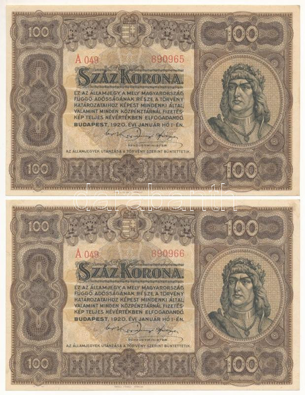 Hungary 1920. 100 Korona (2x) with "Orell Füssli Zürich" printer's mark, consecutive serials "A 049 890965 - A 049 890966" C:AU