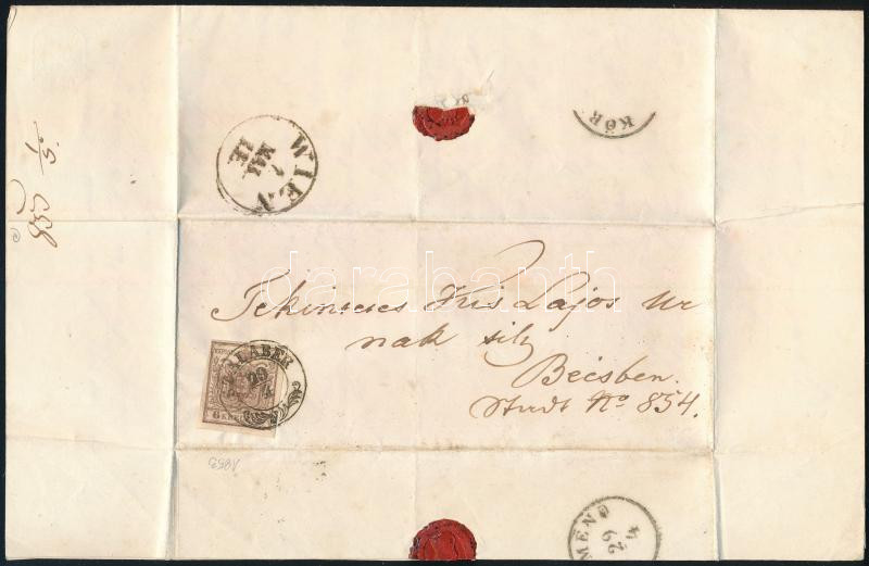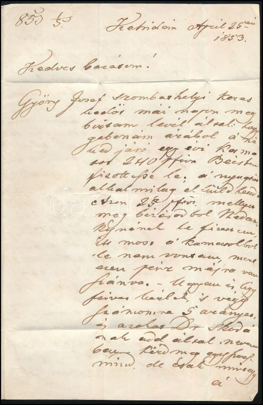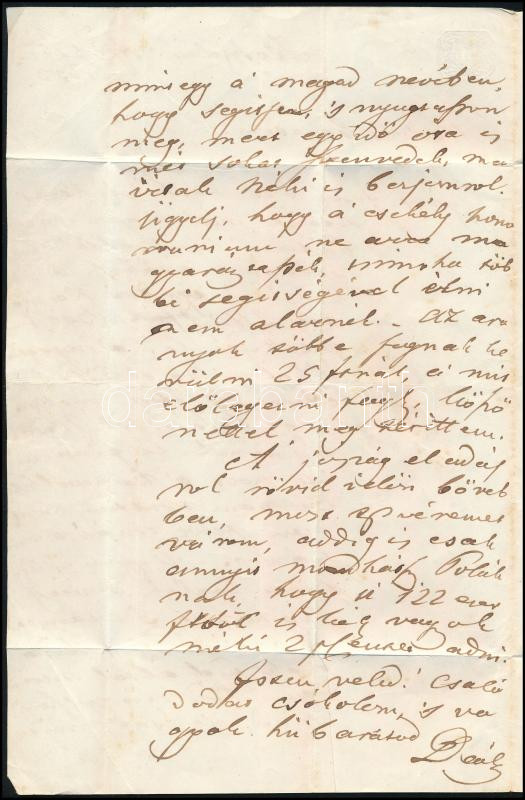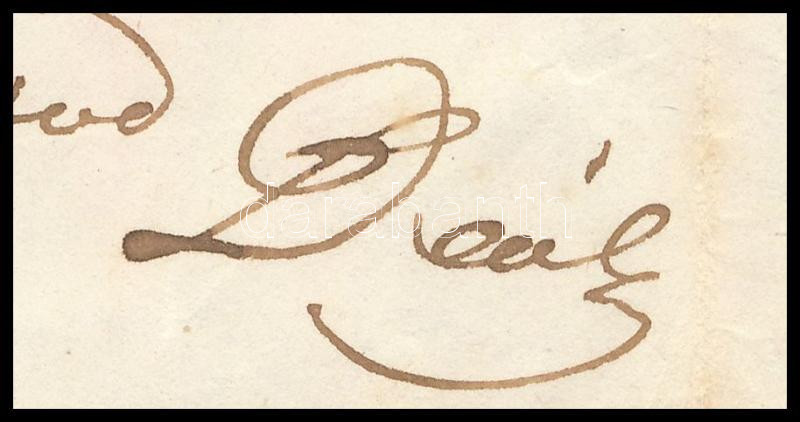 1853 Deák Ferenc (1803-1876) államférfi, miniszter autográf levele Kehidai birtokáról Bécsbe. A címzett Kis(s) Lajos hivatalnok, aki korábban a Helytartótanácsnál, majd 1848-ban a Deák által vezetett igazságügyminisztériumban volt osztálytanácsos. ,,Kedves barátom!" megszólítással induló levélében Deák főként pénzügyekkel kapcsolatos témákról ír; több feladattal megbízza Kisst, pl.: ,,végy számomra 5 aranyat, és azokat Dr. Skodának [Josef Škoda (1805-1881) cseh származású osztrák orvos, klinikai belgyógyász?] add által nevemben. Kérd meg egyszersmind, de csak mintegy a magad nevében, hogy segítsen, 's nyugtasson meg, mert egy idő óta ismét sokat szenvedek ...". Két beírt oldal, ,,Hű barátod Deák" aláírással, bélyegzésekkel. Deák a szabadságharc leverése után sértetlenül távozhatott, és háborítatlanul élhetett Kehidai birtokán, visszavonultságban, passzív ellenállásban.