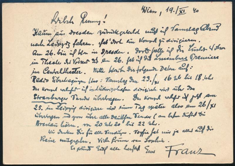 Description: 1940 Lehár Ferenc (1870-1948) zeneszerző német nyelvű, autográf levelezőlapja Papházy Istvánnénak Bécsből / 1940 Autograph postcard of Franz Lehar (1870-1948) from Vienna