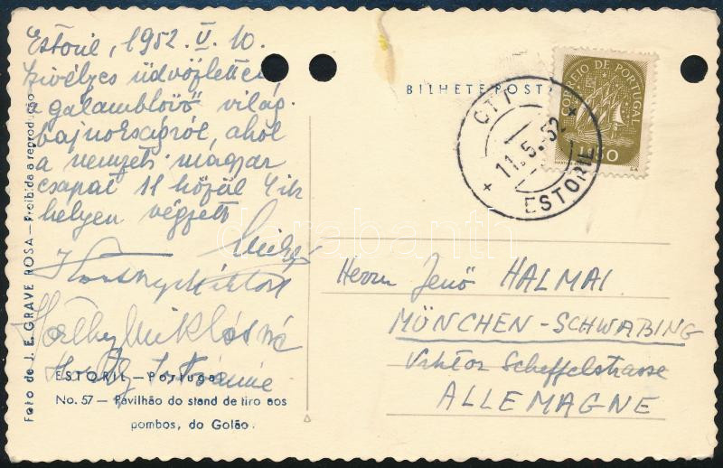 1952 "Estoril, 1952. V. 10. Szívélyes üdvözlettel a galamblövő világbajnokságról, ahol a nemzeti magyar csapat 11. közül a 4-ik helyen végzett. " Ifjabb vitéz nagybányai Horthy Miklós (1907-1993), vitéz nagybányai Horthy Miklós (1868-1957), Horthy Miklósné jószáshelyi Purgly Magdolna (1881-1959), Horthy Istvánné Edelsheim-Gyulai Ilona (1918-2013) aláírásaival, képeslapon, Münchenbe Halmai Jenő részére, a felületén lyukakkal.