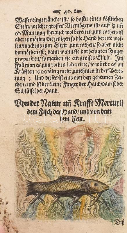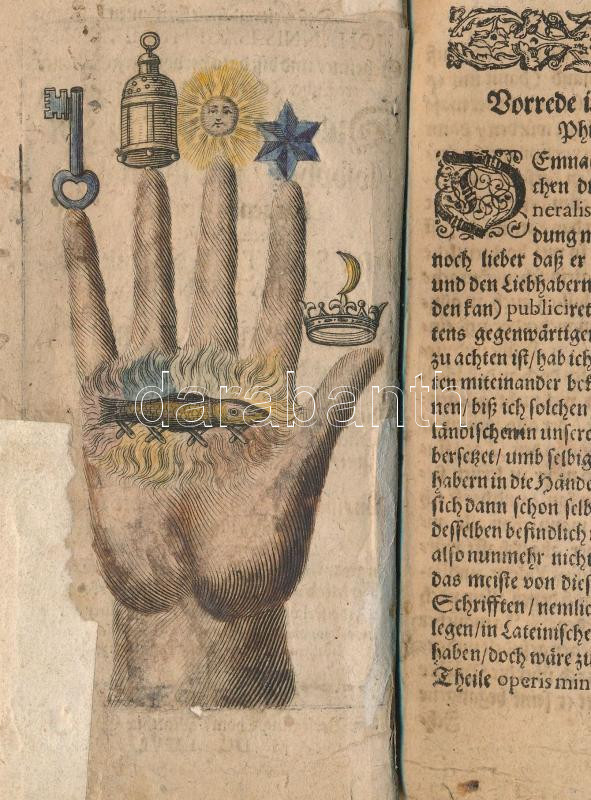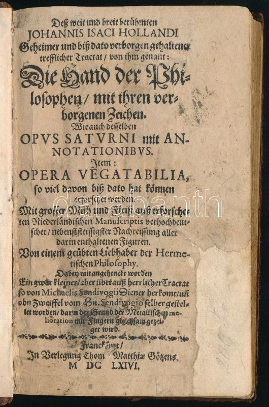 [Alkímia] (Johann Isaac Hollandus) Johannis Isaci Hollandi: Geheimer und biß dato verborgen gehaltener trefflicher Tractat, von ihm genant: Die Hand der Philosophen. Frankfurt, 1667, Thom. Matthiae Götzens (Thomas Matthias Götze), 160 p. Első kiadás! Ritka, korai alkimista munka. Német nyekven. Számos szövegközti színezett fametszetű és fekete-fehér fametszetű ábrával. Gerincén sérült korabeli egészbőrkötésben, az előzéklapokon, különböző nyelvű, korabeli bejegyzésekkel, ábrákkal, titkosírás abc-vel, a címlap restaurált, valamint néhány lap kissé restaurált, két lap hiánnyal (7/8., 9/10.) / First edition! A rare early alchemical work. 160 p. In German language. With numerous intertextual colored woodcut illustrations. Damaged on the spine in contemporary leather binding, on the front pages, with contemporary inscriptions in different languages, figures, cipher with abc, two pages lost (7-8.,9-10.) The title page and some pages are slightly restored.
