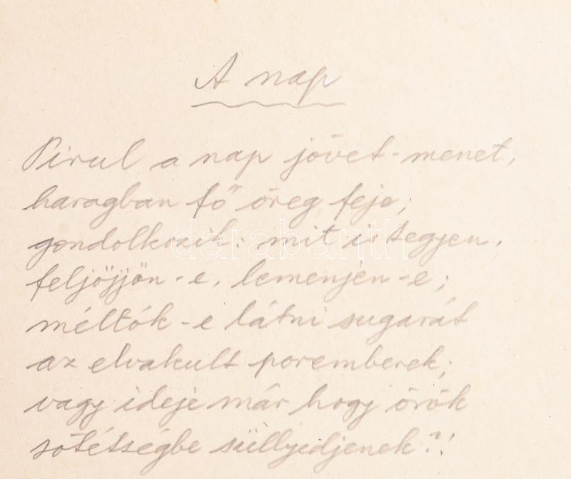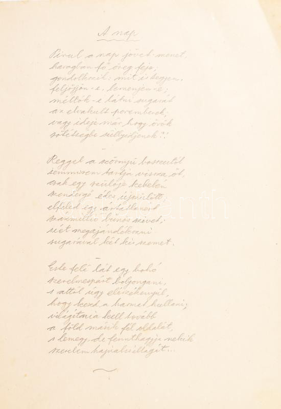 Erdélyi József (1896-1978) Baumgarten-díjas költő, ,,a 20. századi magyar költészet egyik legjelentősebb képviselője", A nap című, 3x8 soros versének, ceruzával írt, autográf kézirata. Első közlése a Napkeletben volt 1930-ban. Kötetben először a fehér Toronyban jelent meg. Egy A/4-es levél, egy oldalán írva.
