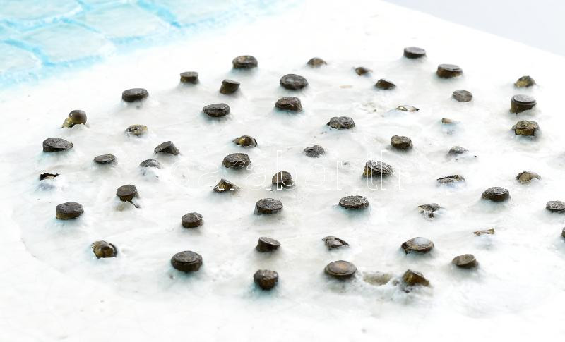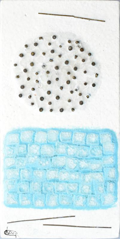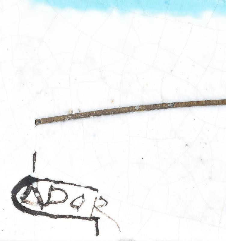 Description: Gádor István (1891-1984): Geometrikus falikép. 1970 körül. Mázas samottos kőagyag plakett, mázba foglalt, geometrikus elemeket képező réz szál, üvegmassza és vas hengerszelet díszítéssel. Minimális kopással, a samottos anyag jellegéből, illetve az alkotói anyagformálásból adódó esztétikai hibával, 40x20 cm.