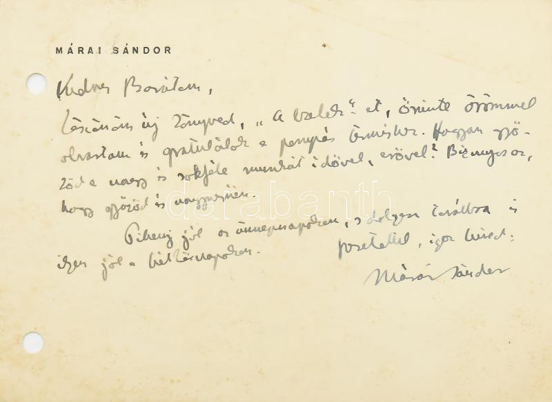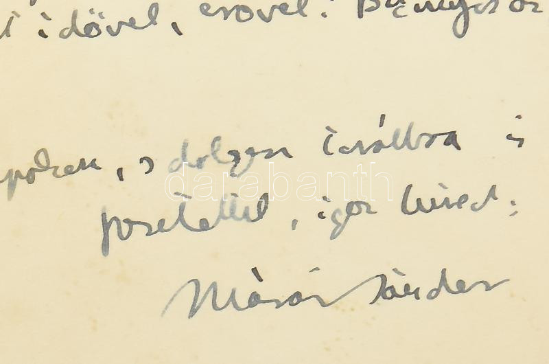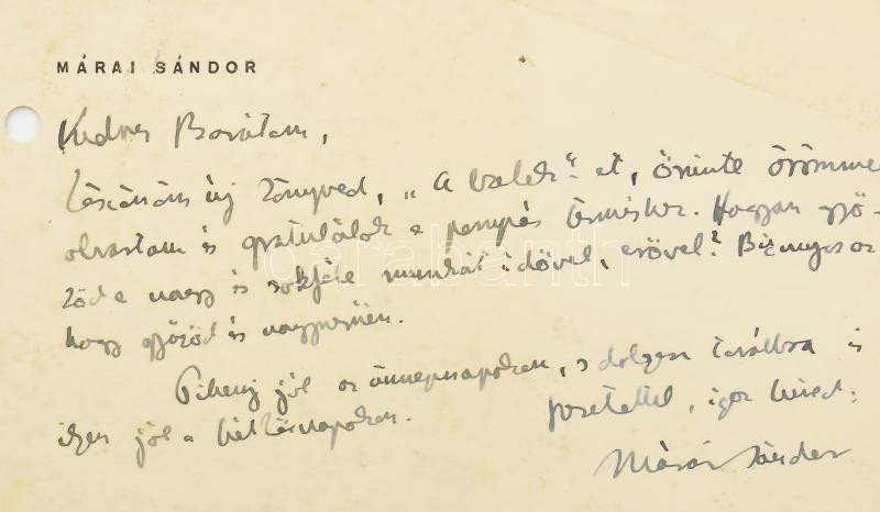 cca 1938 Márai Sándor (1900-1989) író autográf üdvözlő és gratuláló so... https://www.darabanth.com/en/42-Major-auction/42.1/Other-collectibles-Live/Art-collectibles-floor-auction-items~17539/cca-1938-Marai-Sandor-1900-1989-iro-autograf-udvozlo-es-gratulalo-sorai-ifj-Bokay-Janos~II3119110