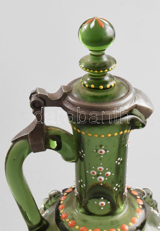 Description: Dolega, lengyel törzsi címeres pálinkás kiöntő. Kézzel festett, fújt hutaüveg. Csiszolt üveg, ón rátéttel XIX sz. / Dolega, brandy pourer with Polish tribal coat of arms. Hand-painted blown glass. Polished glass with pewter overlay, 19th century.21 cm