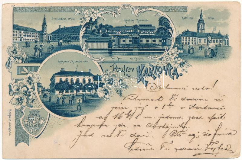 1901 Károlyváros, Karlovac; Pravoslavna crkva, Gradsko kupaliste, katolicka crkva, na Korani, Ljekarna "K crnom orlu" / Orthodox and Catholic churches, spa, pharmacy. J. Sagana Art Nouveau, floral, litho (EK)