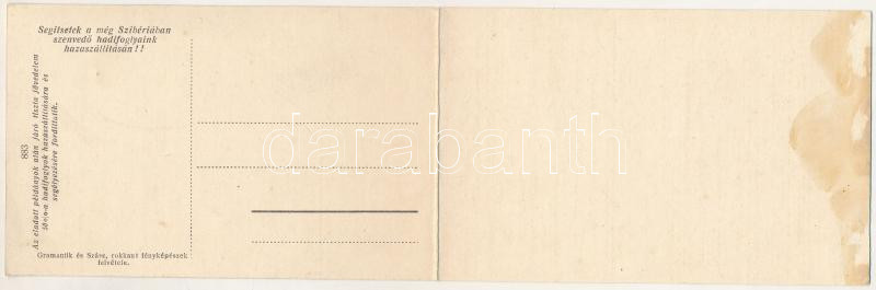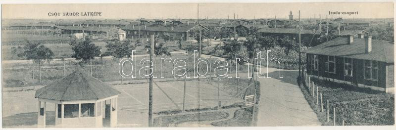 Csót, hadifogolytábor látképe, iroda csoport, teniszpálya. Gramantik és Szász rokkant fényképészek felvétele. "Segítsetek a még Szibériában szenvedő hadifoglyaink hazaszállításán!" 2-részes kinyitható panorámalap (Rb)