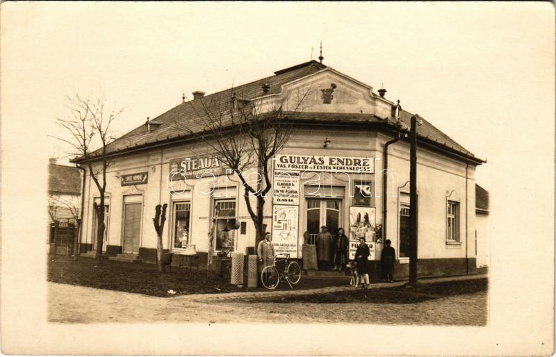 Püspökladány, Gulyás Endre vas-, fűszer és festék kereskedés, Spitz Henrik üzlete, Steaua Kőolaj kereskedlemi rt., photo (fl)
