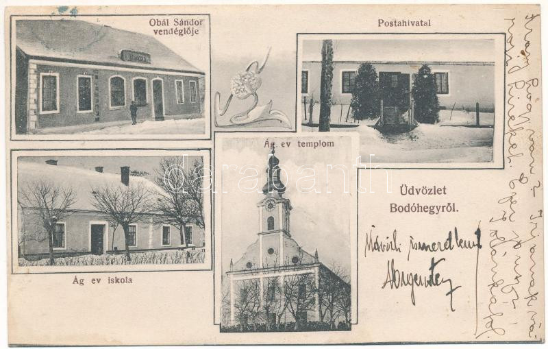 Description: 1918 Bodóhegy, Bodonci; Ágostai evangélikus templom és iskola, postahivatal, Obál Sándor vendéglője, étterem, téli képek / Lutheran church and school, post office, restaurant, winter (fl)
