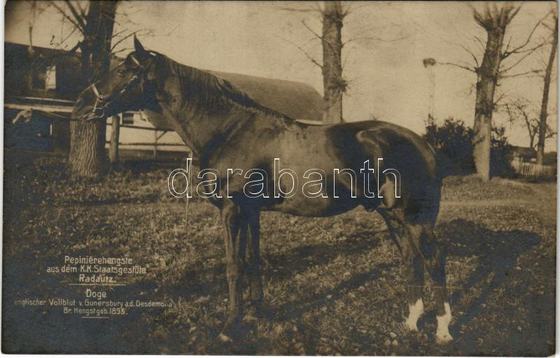 Description: Radauti, Radóc, Radautz (Bukovina, Bucovina, Bukowina); Pepinierehengste aus dem K. K. Staatsgestüte. Doge englischer Vollblut v. Gunersbury a. d. Desdemona / K.u.K. stud farm, stallion. Buchhandlung Herzberg (fl)