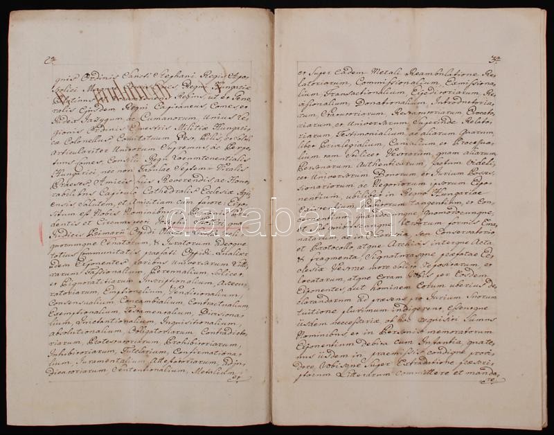 Description: 1792 Az egri káptalan oklevele, amelyben átírja Habsburg-Lotaringiai Sándor Lipót főherceg, magyar nádor (1790-1795) és I. Lipót magyar király (1657-1705) Olaszliszka mezőváros részére tett adományleveleit, rányomott viaszpecsét nyomával, az utolsó lap sérült, 22+1 p.