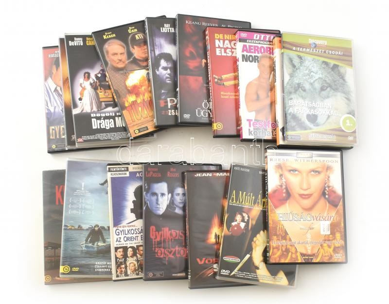 17 db DVD filmek (2db bontatlan) (A Kút 2016-ban bemutatott magyar film, amelyet Gigor Attila rendezett és írt./ Az Utóélet 2014-es magyar film, írója és rendezője Zomborácz Virág./ A Gyilkosság az Orient Expresszen 1974-ben bemutatott színes, angol bűnügyi film./ Gyilkos ösztön - DVD Amerikai film/ A Vörös sziréna egy 2002-es francia krimi, Maurice G. Dantec azonos nevű regénye alapján./ A Femme Fatale egy 2002-ben bemutatott erotikus thriller, amelyet Brian De Palma írt és rendezett./ A Dögölj meg, drága Mona! 2000-ben bemutatott amerikai bűnügyi vígjáték, melyet Peter Steinfeld forgatókönyvéből Nick Gomez rendezett./ Az ördög ügyvédje 1997-ben bemutatott amerikai thriller./ A Nagyfater elszabadul 2016-ban bemutatott amerikai filmvígjáték, amelynek rendezője Dan Mazer, / NORBI - AEROBIK NORBIVAL 1. / NORBI - AEROBIK NORBIVAL 2. / stb.)