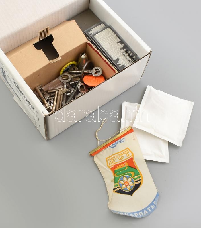Egy doboznyi vegyes bolha tétel, benne két betűkészlet bélyegzőhöz, diatároló diaképekkel, kulcsok, stb.