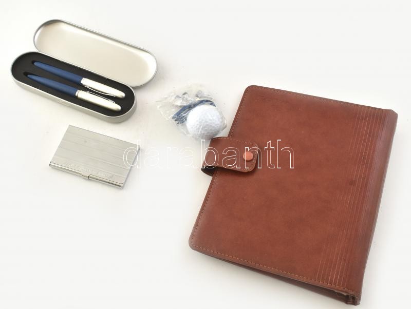 Malév relikviák: golflabda, bőr irattartó, tollak, névjegytartó.
