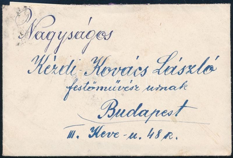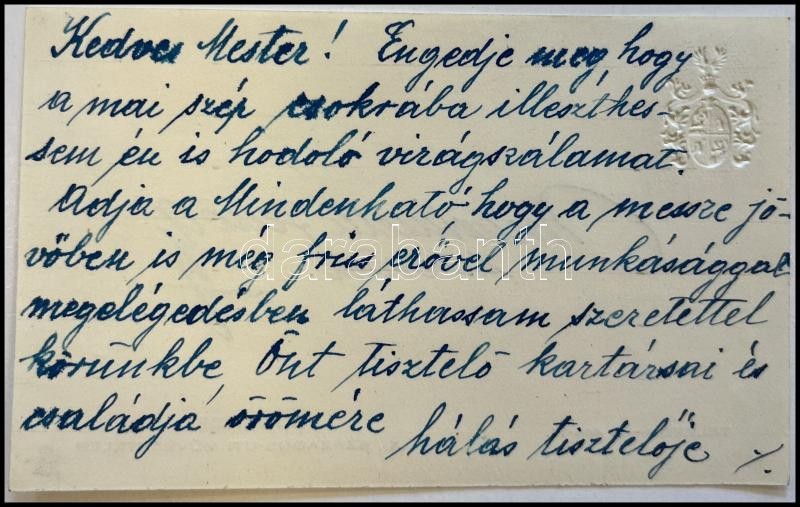1930.március Martinelli JenÅ‘ (1886-1954) szobrászművész autográf gratuláló sorai Kézdi-Kovács László (1864-1942) festÅ‘művészhez. Martinelli JenÅ‘ cÃmeres, dombornyomott névjegykártyáján, eredeti borÃtékban.