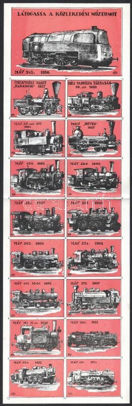 cca 1960-1970 Közlekedési Múzeum, MÁV mozdonyok gyufacímke teljes ív, 16+1 db, hajtott