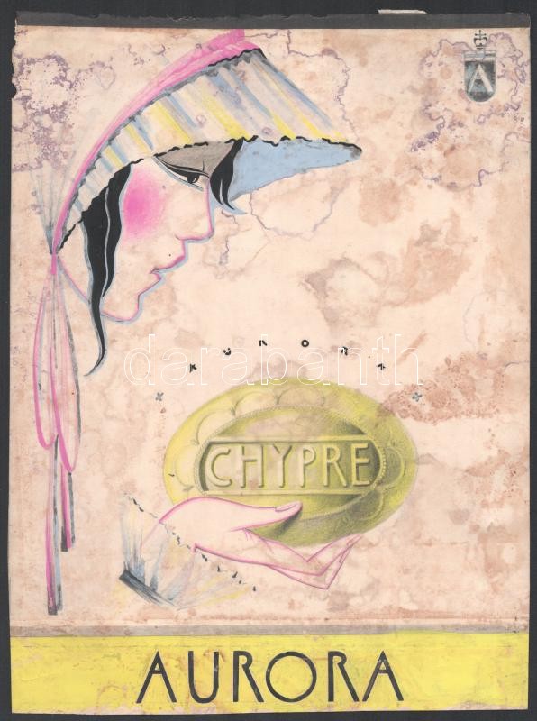 Description: Aurora Chypre,.art deco plakát- v. reklámterv, 1925-30 körül. Tempera, ceruza, karton. Jelzés nélkül, feltehetően Galambos Margit (?-?) alkotása. Foltos, sérült. 28,5x21,5 cm.