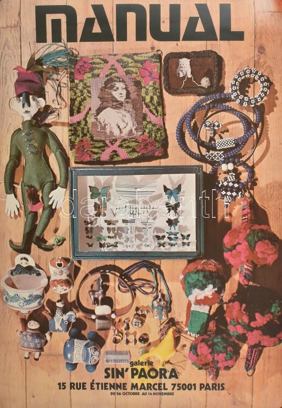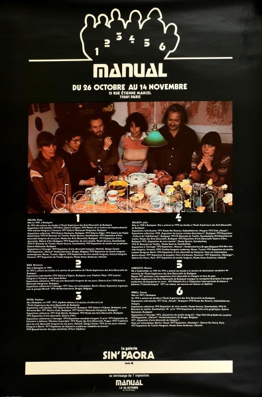 cca 1978 Manual művészcsoport kiállítási plakátja (Szilasi Anna, Bán Mariann, Vladimir Péter, Szilágyi Júlia, Horváth Márton, Péreli Zsuzsa), Paris, Galerie Sin' Paora, francia nyelvű kétoldalas kiállítási plakát, 67x47 cm