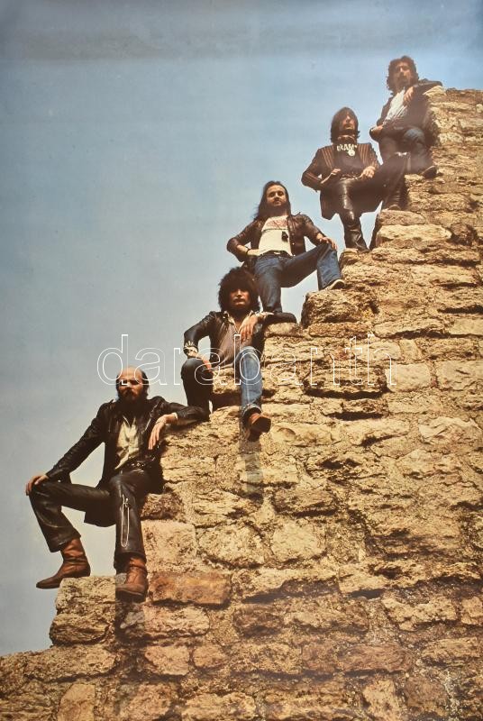cca 1979 Piramis magyar rock együttes plakátja, (Som Lajos, Závodi János, Révész Sándor, Gallai Péter, Köves Miklós), fotó: Szebeni András. Bp., Képzőművészeti Alap, (Bp., Offset-ny.), a sarkain kis lyukakkal, a sarkok hátoldalain ragasztásnyomokkal, a szélein kis gyűrődésekkel, 97x67 cm