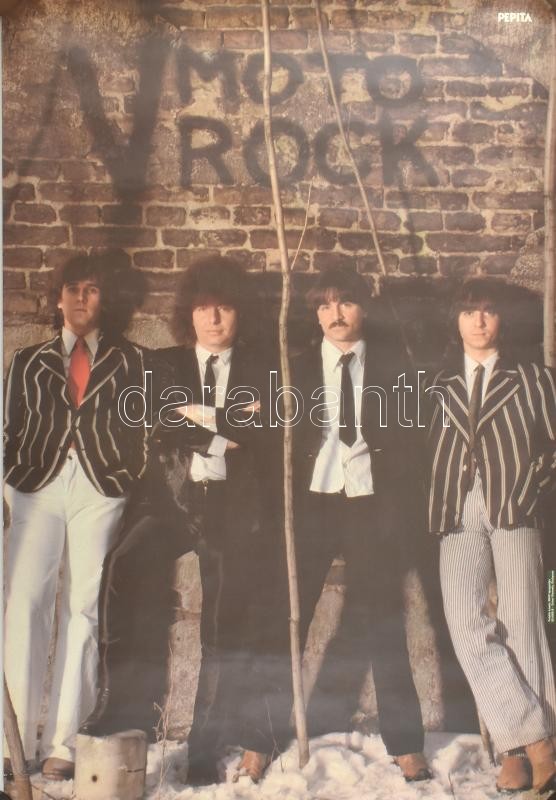 cca 1980 V'Moto-Rock (Demjén Ferenc,Menyhárt János,Herpai Sándor,Lerch István), magyar rock együttes plakátja, [grafikus: Koncz András, fotó: Diner Tamás], Pepita, Bp., Zrínyi, sarkain kis lyukakkal, a sarkak hátoldalán ragasztásnyomokkal,81x56 cm