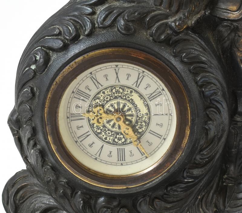 Figurális lovag, asztali óra, mechanikus szerkezettel, működik, korának megfelelő sérülésekkel. M: 34 cm