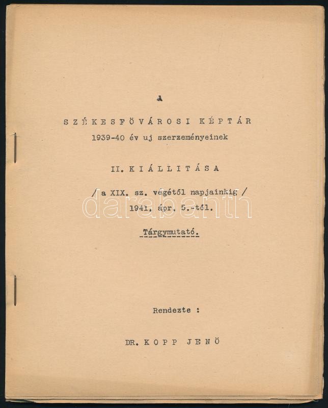 2 db SzékesfÅ‘városi Képtár katalógus: A SzékesfÅ‘városi Képtár 1939-40 év uj szerzeményeinek II. kiállÃtása (a XIX. sz. végétÅ‘l napjainkig), 1941. ápr. 5.-tÅ‘l. Tárgymutató. Tűzött papÃrkötés. + A SzékesfÅ‘városi Képtár 1941-42 év uj szerzeményeinek kiállÃtása (XVIII. sz. végétÅ‘l napjainkig), 1943. márc. 6.-tól Tárgymutató. Tűzött papÃrkötés, foltos borÃtóval és lapokkal, borÃtó hátulja sérült.