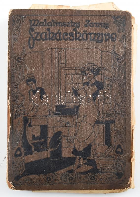 Malatinszky Fanny szakácskönyve. Sajtó alá rendezte az "Orsz. NÅ‘képzÅ‘ Egyesület." Bp., én., Légrády. Nyolcadik kiadás. Kiadói egészvászon-kötés, kopott borÃtóval, hiányzó gerinccel, pár lap kijár, az elülsÅ‘ szennylapon és a kötéstábla belsején ceruzás jegyzettel, a hátsó szennylapon hiánnyal, megviselt állapotban. Benne egyéb kb. 25 db nagyrészt kézzel Ãrt, és kisebbe részben nyomtatott jegyzetlapokkal, rajta receptekkel.