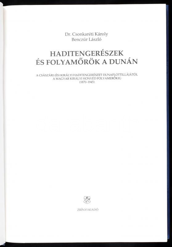 2 db militária témájú könyv: Balla János - Hrenkó Pál: A magyar katonai térképészet története. I. köt. Bp., 1991, HM Térképész Szolgálat Főnökség. Fekete-fehér képekkel illusztrált. Kiadói műbőr-kötés. Megjelent 2000 példányban. + Csonkaréti Károly - Benczúr László: Haditengerészek és folyamőrök a Dunán. A Császári (és) Királyi Haditengerészet Dunaflottillájától a Magyar Királyi Honvéd Folyamerőkig (1870-1945). Bp., é.n., Zrínyi Kiadó. Kiadói kartonált papírkötés.