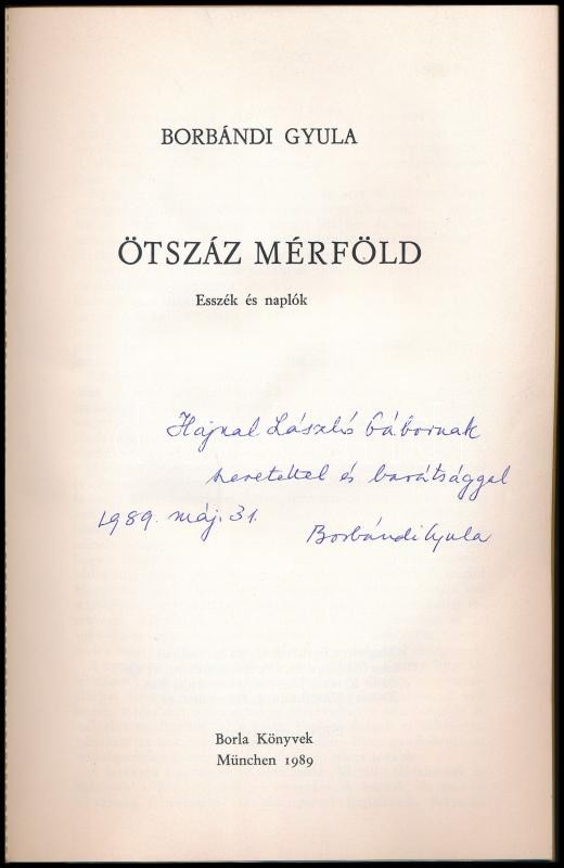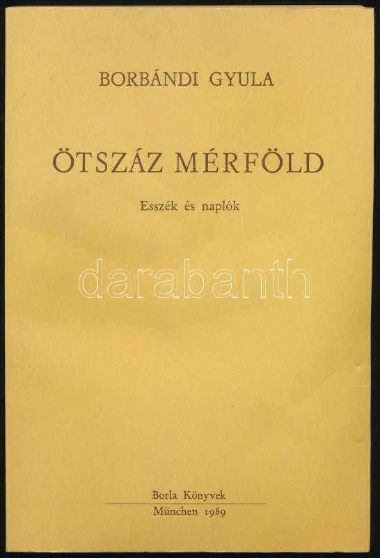 Borbándi Gyula: Ötszáz mérföld. Esszék és naplók. München, 1989, Borla... https://www.darabanth.com/en/420-Online-auction/420.0/Books/Books-Other-rarities~1500022/Borbandi-Gyula-Otszaz-merfold-Esszek-es-naplok-Munchen-1989-Borla-Konyvek-Emigrans-~II2654157