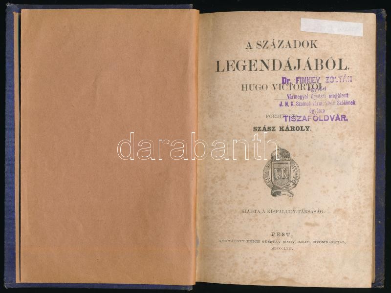 Hugo, Victor: A századok legendájából. Ford.: Szász Károly. Pest, 1862, Kisfaludy-Társaság (Emich Gusztáv), XVII+(1)+159+(3) p. Első magyar kiadás. Átkötött egészvászon-kötés, márványozott lapélekkel, kopottas, foltos borítóval, foltos lapokkal, tulajdonosi névbejegyzéssel és bélyegzőkkel. Ritka!