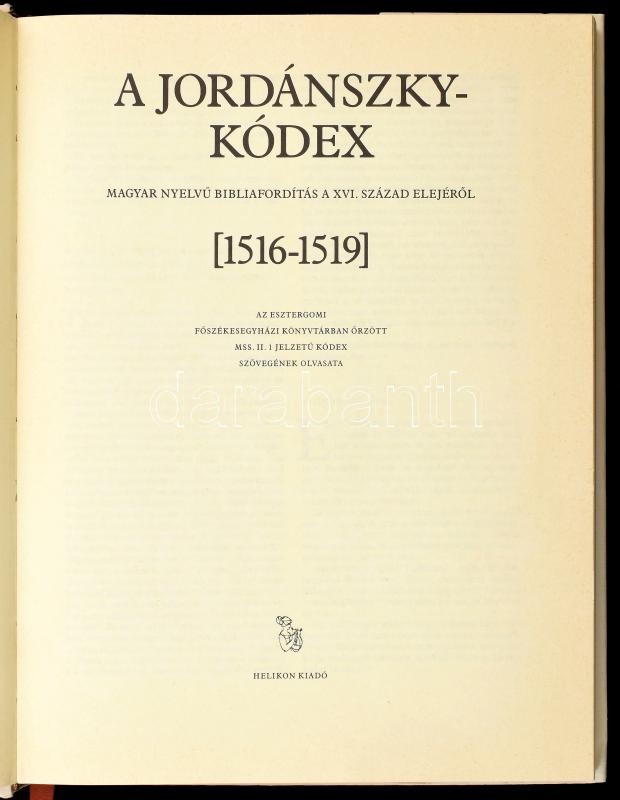 Jordánszky-kódex. A Jordánszky-kódex, magyar nyelvű bibliafordítás a XVI. század elejéről. [1516-1519.] Az Esztergomi Főszékesegyházi Könyvtárban őrzött MSS. II. 1. jelzetű kódex szövegének olvasata. Hasonmás kiadás és tanulmánykötet, két kísérőfüzettel. Csapodi Csaba: A Jordánszky-kódex. Utószó és szómagyarázatok a Jordánszky-kódex olvasatához. Bp., 1984 Helikon. Kiadói bordázott gerincű egészműbőr-kötés, fém kapcsokkal és veretekkel, és kiadói kartonált papírkötés, kiadói papír védőborítóban, kartontok nélkül, egyébként jó állapotban.