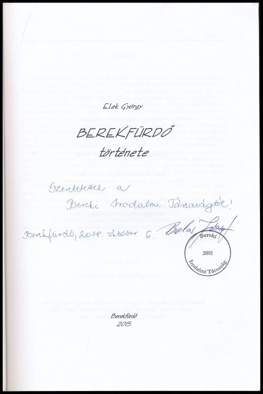 Elek György: Berekfürdő története. Berekfürdő, 2015, Bereki Irodalmi Társaság. Második kiadás. Fekete-fehér képekkel illusztrálva. Kiadói papírkötés. Megjelent 500 példányban. A Bereki Irodalmi Társaság ajándékozási bejegyzésével és bélyegzőjével.
