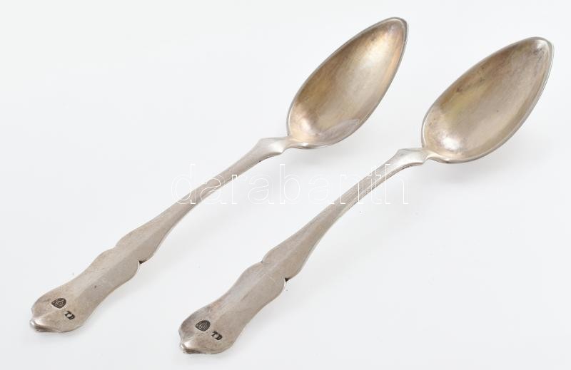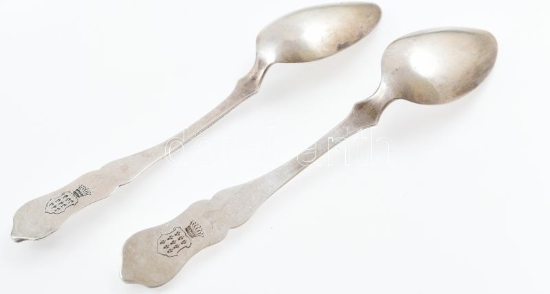 2 db ezüst (Ag) antik teáskanál bárói (Baratta Dragono család címere) címerrel. Jelzett (Bécs, 1858), h: 15 cm, össz. nettó: 54 g