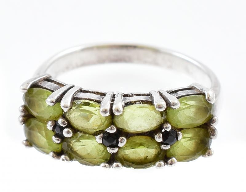 Ezüst(Ag) gyűrű zöld kövekkel, jelzett, méret: 58, bruttó: 4,8 g
