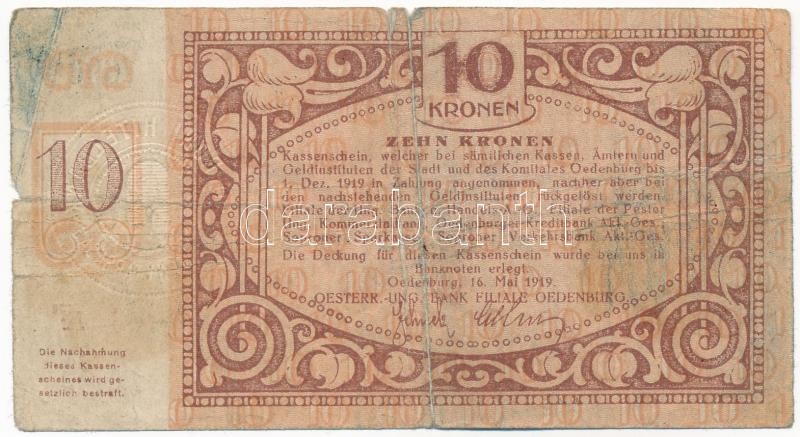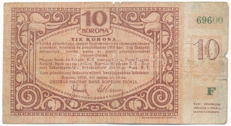 Sopron 1919. 10K "F 69600" csak részben kiolvasható ".....