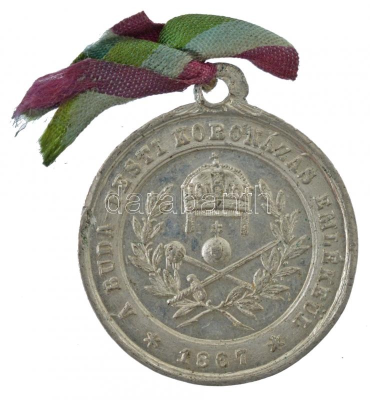 1867. "A Buda-Pesti koronázás emlékéül" kétoldalas ón(?) emlékzseton szalagon (22mm) T:2-,3 nagyobb ph, anyaghiány