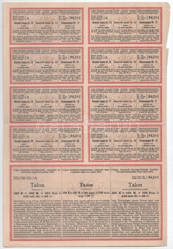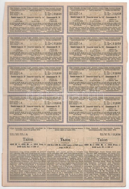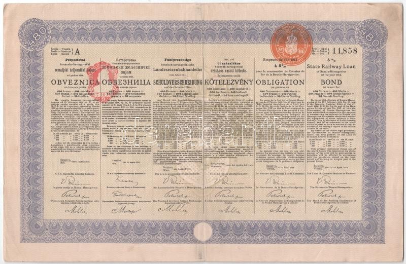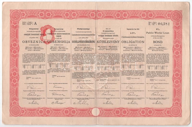 Ausztria / Szarajevó / Bécs 1914. "1914. évi öt százalékos bosnyák-hercegovinai országos beruházási kölcsön" bemutatóra szóló kötvénye 480K-ról, szárazpecséttel, bélyegzéssel, szelvényekkel + Ausztria / Szarajevó / Bécs 1914. "1914. évi öt százalékos bosnyák-hercegovinai országos vasúti kölcsön" bemutatóra szóló kötvénye 480K-ról, szárazpecséttel, bélyegzéssel, szelvényekkel T:II-,III Austria / Sarajevo / Wien 1914. "Public Works Loand Bond for Bosnia and Herzegovina of 1914" about 480 Corona, with embossed stamp, coupons and cancellations + Austria / Sarajevo / Wien 1914. "State Railway Loand Bond for Bosnia and Herzegovina of 1914" about 480 Corona, with embossed stamp, coupons and cancellations C:VF,F