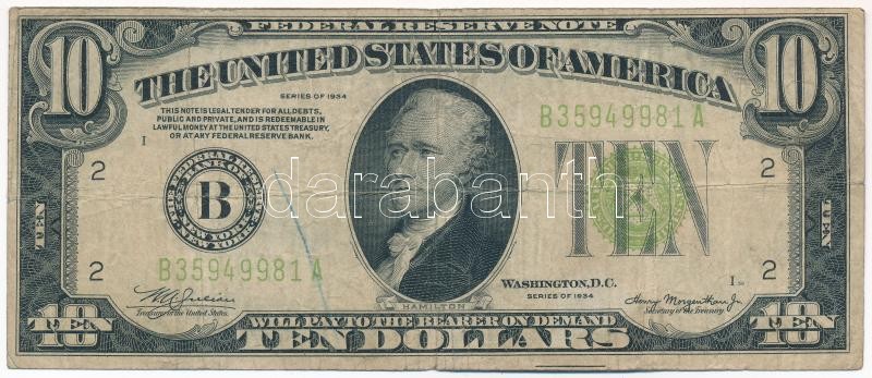 Amerikai Egyesült Államok 1934. 10$ "B 35949981 A" T:III- ki... https://www.darabanth.com/en/420-Online-auction/420.0/Numismatics/Worldwide-banknotes~2000015/Amerikai-Egyesult-Allamok-1934-10USD-B-35949981-A-TIII-kis-szakadas-firka-USA-1934-10-Dolla~II2655382