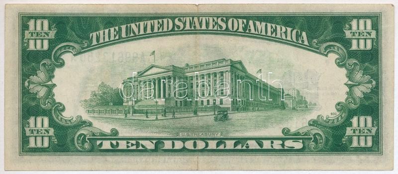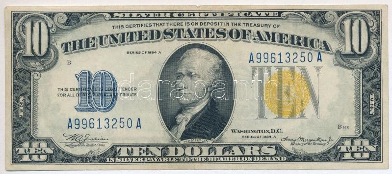 Amerikai Egyesült Államok 1934A 10$ "A99613250A" "Silve... https://www.darabanth.com/en/420-Online-auction/420.0/Numismatics/Worldwide-banknotes~2000015/Amerikai-Egyesult-Allamok-1934A-10USD-A99613250A-Silver-Certificate-kismeretu-sarga-pecset-~II2665452